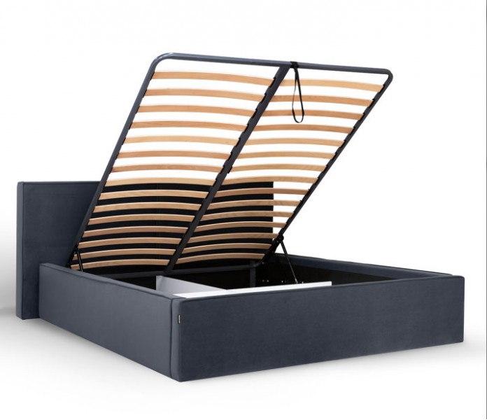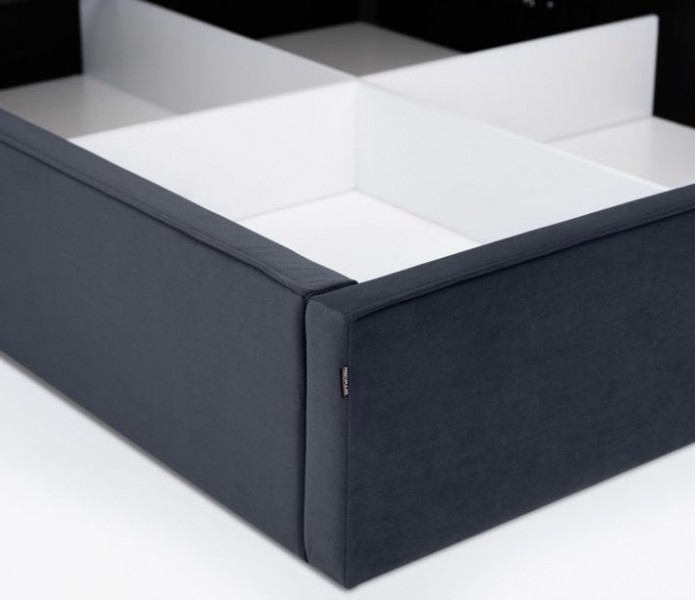 - Мягкая кровать с четкими линиями и двойной спинкой в графитовой ткани – геометрия, создающая ощущение упорядоченности и стабильности
