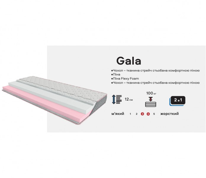 Матрас Gala / Гала высотой 12 см с разносторонней жесткостью сторон. Первая сторона средней жесткости (3), вторая сторона умеренно-жесткая (4). Допустимая нагрузка на одно спальное место до 100 кг.