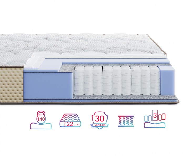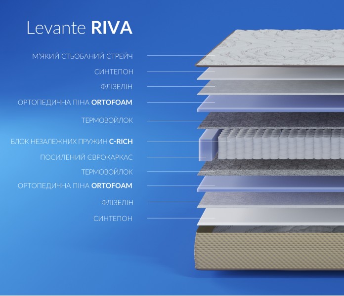 Матрас Levante Riva / Рива высотой 22 см с одинаковой жесткостью сторон. Первая сторона средней жесткости (3), вторая сторона средней жесткости (3). Допустимая нагрузка на одно спальное место до 140 кг.