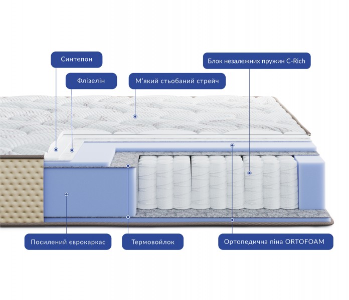 | Наполнитель | Пена Ortofoam™, Термовойлок, Блок независимых пружин C-Rich, Еврокаркас |