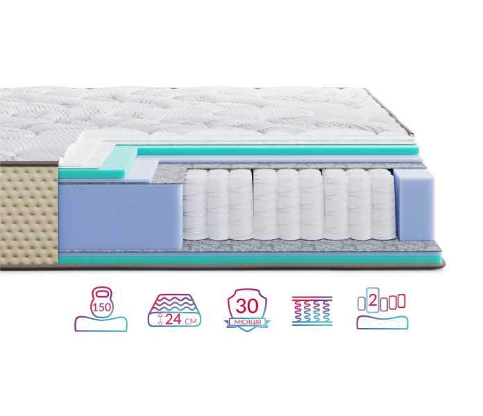 Матрас Levante Amura / Амура высотой 24 см с одинаковой жесткостью сторон. Первая сторона умеренно-мягкая (2), вторая сторона умеренно-мягкая (2). Допустимая нагрузка на одно спальное место до 150 кг.